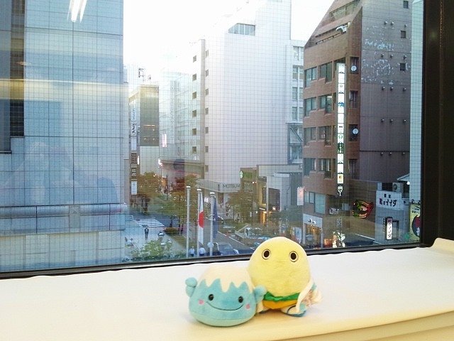 もう一枚は急激に登場回数が増えている、まゆまろくんと富士山君のツーショット!!お店から見えるビル群をバックにパチリです。少し見下ろしてる感があるのに気が付かれた方は、鋭い!!実はお店は4Fなんですよ。