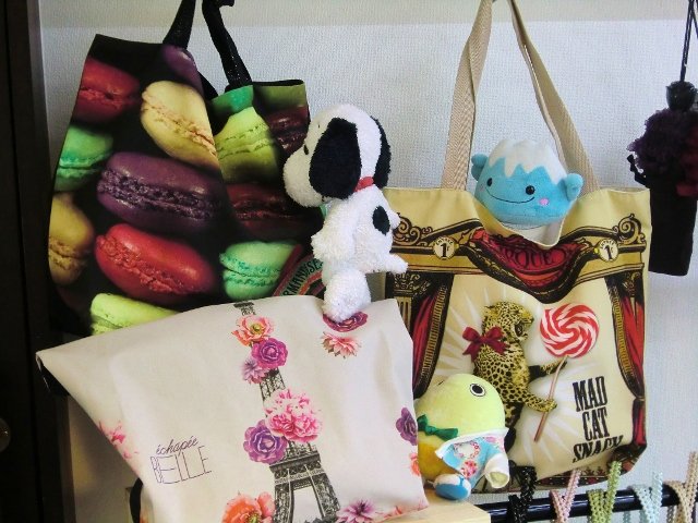 今日、みんなのおもちゃになったのは、フランス製のおしゃれなバッグです。マカロン!エッフェル塔!そして、インパクト大のヒョウ!!どれも、フランスならではの色使いでおしゃれです。