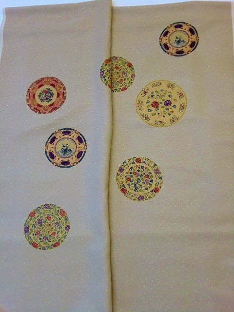 カフェオレ色の地色に、伊万里の絵皿の柄の絵羽輪奈ビロードコートです。この輪奈ビロードは、あられの地紋が織り込まれています。2枚目の写真は背中です。絵羽付けになっているので背中心部分の柄がはつながります☆