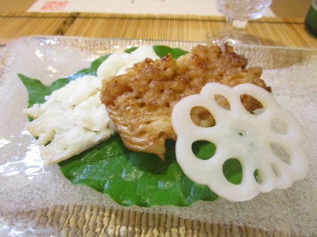 そして、何個か飛んでぜったい外せない八寸です。枝豆ととうもろこしのかき揚げ、えびさん、ち鮎、そしてはもの珍味の数々。美味しい
