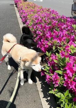 プーさん店長さんとりきちゃん、ぎんちゃんの朝のお散歩は、ちょうど良い気候で気持ちの良い日が続いているようです。例年より早く満開になっているつつじの香りをりきちゃん、ぎんちゃんはクンクンです♪この沢山あるお花の中で、二匹揃って気になる一輪のお花があった様で、取り合う様にクンクンしてたみたいです。どんな特別な香りだったのか気になる所ですね。