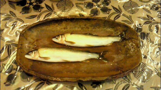 いつも食べる前には写真を撮る気でいるんです。でも、気が付くとおなかの中に納まっちゃっているんですよね。今回も又、やっちゃいましてショック・・・。でもたくさん届いていたので、家族三人でたっぷり食べてもまだ二匹残ってたんです。という事で、生の鮎ちゃんをお皿に並べてパチリです。