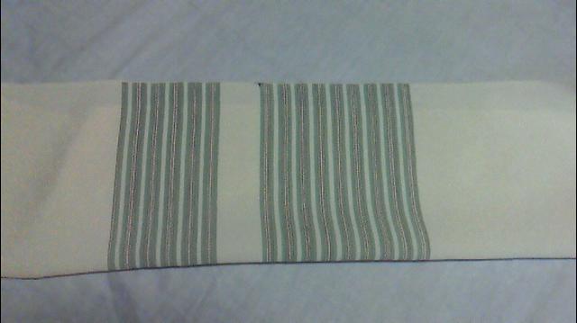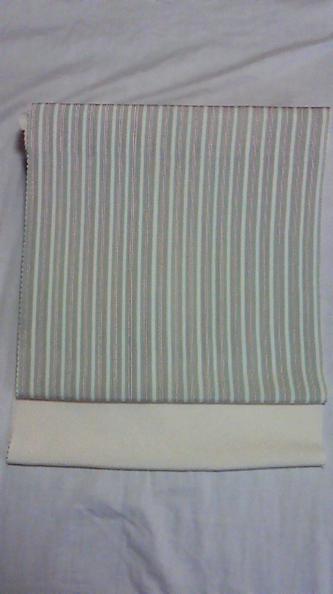 さわやかな色の染め名古屋帯です。グリーンの2本の縞の間に赤い2本の線が入った親子縞と呼ばれる縞模様です。