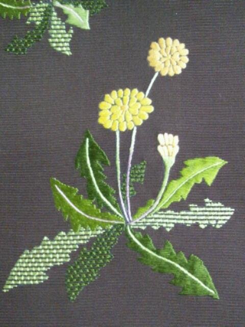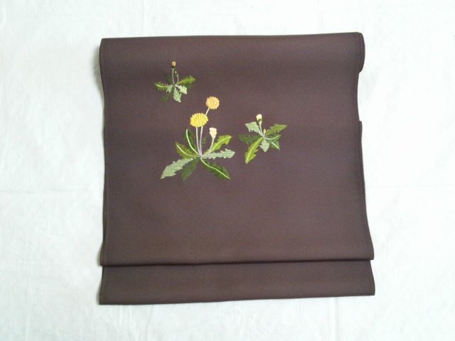 チョコレート色の塩瀬地にかわいらしくタンポポが刺繍されています。濃い地色にタンポポの黄色と葉の緑色が映えます。春になると薄い色のお着物が増えてくるので、濃い地色の帯でぐっとしめるとオシャレですね。どんな小物を使うのか考えるとワクワクしてきます。