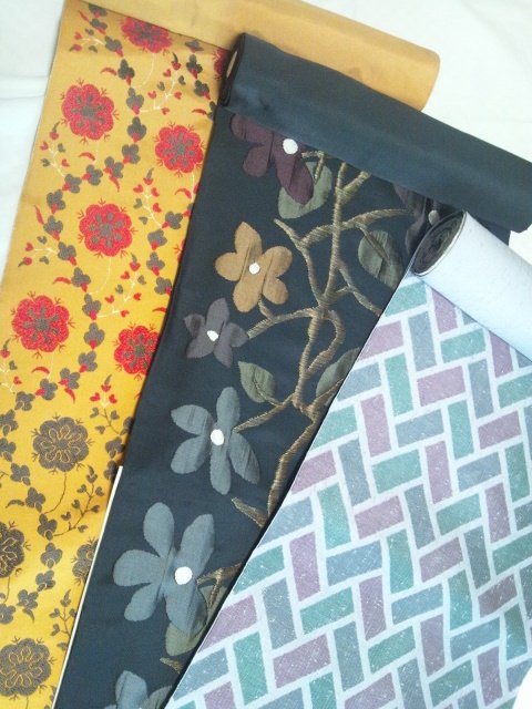 一枚目は、帯ですね。左から黒地に橘が鮮やかな袋帯。古箔にらくだがモダンな袋帯。タンポポ柄ですが豪華な唐織りの袋帯。そして、下に並ん出るのは、洛風林や譽田屋源兵衛のおしゃれな袋帯です。
