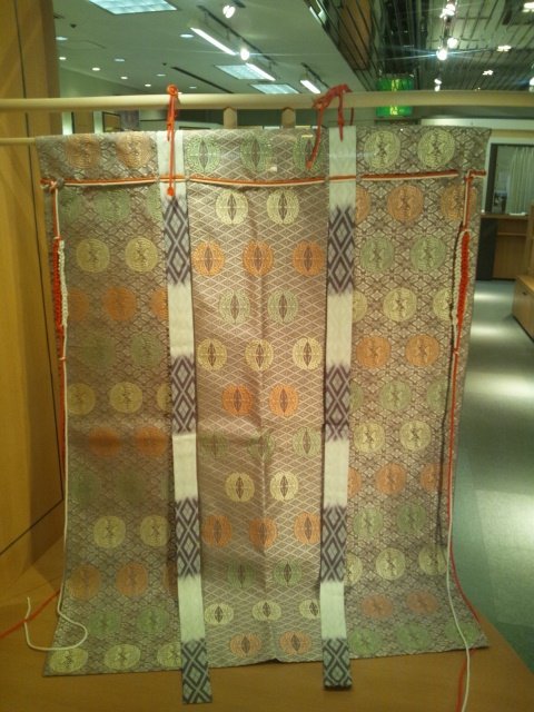 一枚目の写真は、会場の入口に展示している几帳をパチリです。もちろん西陣織です!!元々は、お部屋の仕切りに使われていたのは、皆さまご存知ですよね?それ以外にも、お客様だから慌ててお片付け・・・何て時には、几帳の裏に隠したりと実用的なものでしたが、几帳をたくさん並べて仕切っていると邪魔!と思った昔の人達が襖を作っちゃったみたいですよ。それからは、実用品から飾り物に変わっていきました。脇に下がっている紐。五色に華やかになっているものをご覧になったことがあるかと思いますが、宮中などで使われる正式な物はこの几帳と同じ紅白の紐だそうですよ。