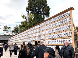 北野天満宮では御祭神としてお祀りしている菅原道真公がなくなった後50年ごとに「大萬燈祭」その間の25年ごとに「半萬燈祭」という祭礼を行っています。2027年に行われる「千百二十五年半萬燈祭」に向けて提燈清祓式が行われ萬燈提燈が奉納されました。提灯の大きさは高さ2・1メートル、直径1・8メートル、重さ約10キロの大きなもので参拝者さんの頭に届きそうなくらいだそうです。2027年9月まで北野天満宮で見る事が出来ますので、お出かけしてみては如何でしょう?