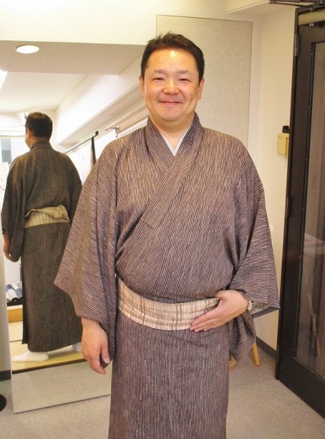 プーさんぽでいつも色々な写真を送ってくれている店長さんが、久々に登場です♪紺地に手描きのようなかすれや不揃い感のある縞模様がお洒落な伊勢型小紋と節感がおしゃれな野蚕糸の角帯を合わせています。衿は薄めの色で顔元スッキリ!?