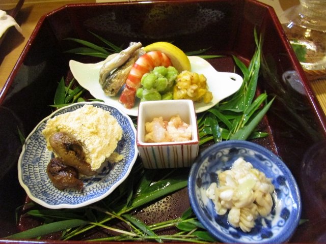 そして、何個か飛んでぜったい外せない八寸です。枝豆ととうもろこしのかき揚げ、えびさん、ち鮎、そしてはもの珍味の数々。美味しい日本酒と合わせて至福の時です。