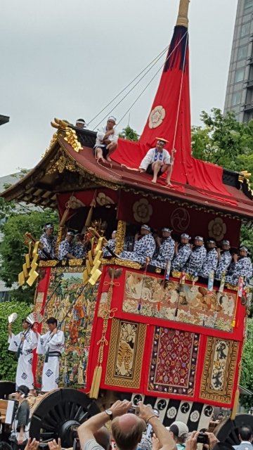 先祭りは23基の山と鉾が巡行します。その中から次は函谷鉾(かんこほこ)です。屋根の上に乗っている人は、8メートルの高さの所に自分自身で持つ綱のみで座ってるんですよ。はたから見てても、けっこう揺れてるのが分かるくらいなんですよ。