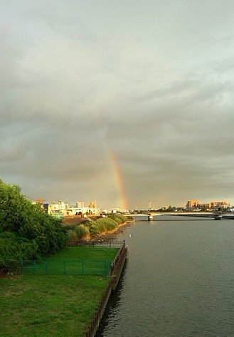 今日届いた写真は、昨日のプーさん店長さんとりきちゃん、ぎんちゃんのお散歩のときの物ですよ。遠くをよぉーく見てくださいね。『虹です!!』雲の中に突き刺さるようにすくっと立ちあがっていますね。