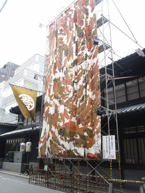 15日は、今回お世話になる問屋さんなどにご挨拶回り。と言いつつ、山鉾や屏風など写真撮ってました。まずは譽田屋源兵さんの前に泳ぐたくさんの鯉さん達をパチリ。金色の鯉さんを見つけると幸せが訪れるそうですよ。ぜひ、写真の中から探してみてくださいね。
