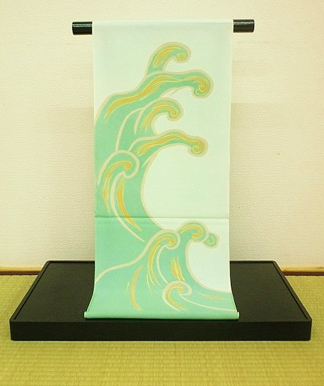 色は二色で、地色が薄萌黄色で波が若竹色のグリーンの濃淡の一枚と地色がブルーで波がワイン色の対比が印象的な一枚です。どちらも波の部分に箔を使う事によって、より迫力、勢いのある波に仕上げています。