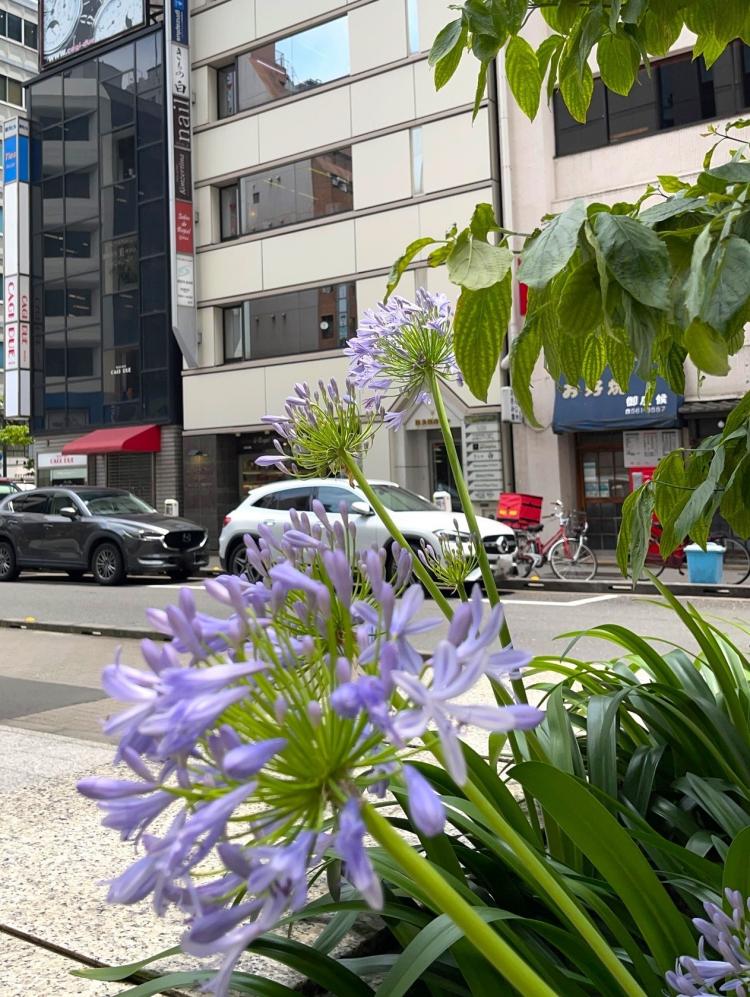 雰囲気のある入り口でいろんな人が写真撮影をしているスポットになっています。そこの花壇にアガパンサスが綺麗に咲いていたので、お使いに行ったついでにパチリ♪そして、よーく見ていただくとアガパンサスの向こうには〝きもの白〟が写っています!!