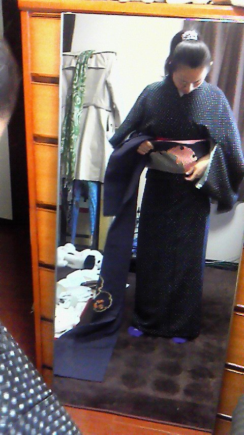 もともと着れないわけではないのですが、ちょこっと怪しい所があるという事で、復習練習をしてみたのですが、やっぱり帯結びってやってないと忘れてしまうみたいですね。帯と格闘している姿をパチリです。