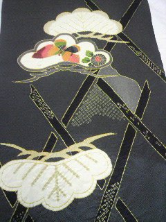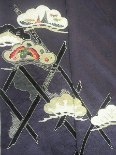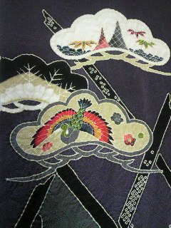 重めの縮緬生地に大胆に松を絞り、その中には鳳凰や蝶などが描かれています。一枚目の写真は上前の柄合わせをしている写真です。松と格子が大きく大胆に絞られています。柄がたっぷり豪華なので、仕立てあがると訪問着のように格があるものになります。