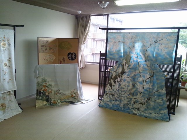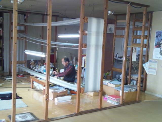 最後に、こちらでなんでも出来ちゃう職人さんをお仕事中でしたがパチリとさせて頂きました。この日は三人の方が生地に向かっていらっしゃいましたが、この方は、図案も書ける、下絵も書ける、直接描いていく無線友禅も出来ちゃう。というスペシャリストだそうです。凄すぎますよね。今回作られていた物もとっても素敵でしたよ。こういう素敵な職人さんたちのおかげで、私たちはいつも素敵なお着物に出会えるんだなあと、あらためて感謝しました!