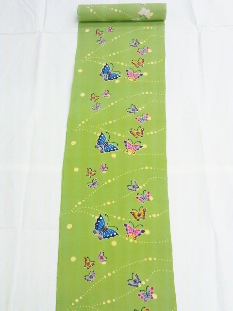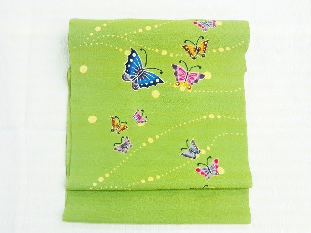 大小さまざまな蝶々が色々な色で描かれていて、とても明るくおしゃれな名古屋帯です。水玉で描かれるうごきある模様が、蝶々たちが楽しそうに飛び回っている雰囲気をより感じられ、可愛らしい印象です。