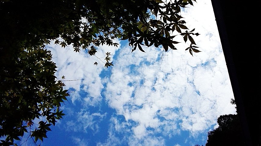 2012.10.05 16:54 白のいろいろ 今日のプーさんぽ!! 番外編 もう一日だけ、京都ひっぱっちゃうことを、お許しくださいね。 今日の写真は“駒ヶ瀧最勝院で撮ったもの”という連絡事項と共に届いたこの写真ですが、とっても綺麗な青空と秋を感じさせる雲、そして、色づく前の青々としたモミジ。とっても綺麗に、なかなかの構図で撮れている二枚のすがすがしい写真ですが、どこなのかは、聞かないとわからないという写真たちです。 きっと、かすかに写る屋根が、最勝院なんでしょう!! by kyoko 白のいろいろ