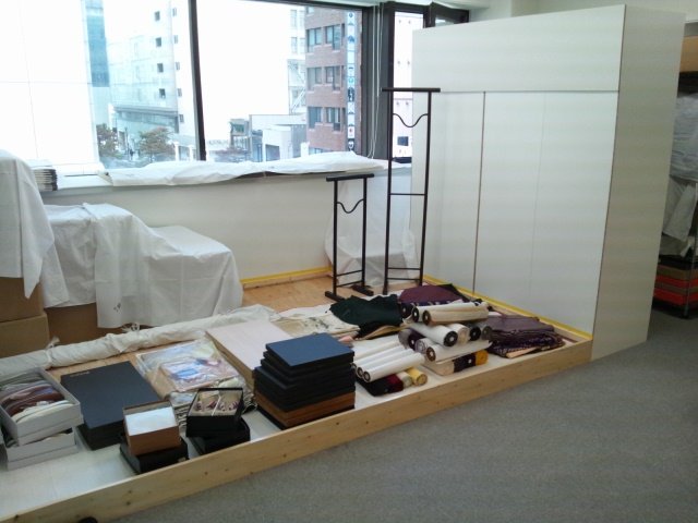 2012.10.20 13:32 白のいろいろ 一回目の工事終わり! なんだか昨日の状態とあまり変わってない感じもしますが、あと、畳を入れると、このコーナーは完成です!!少し変形した畳になるので、もう少し時間がかかるようなので、とりあえず、衣装敷をひいて、少し着物や帯を置いてみました。 まだまだ、段ボールが積みあがってたり、必要なものがそろってなかったりですが、少しずつオープンが近づいてきています!! by kyoko 白のいろいろ