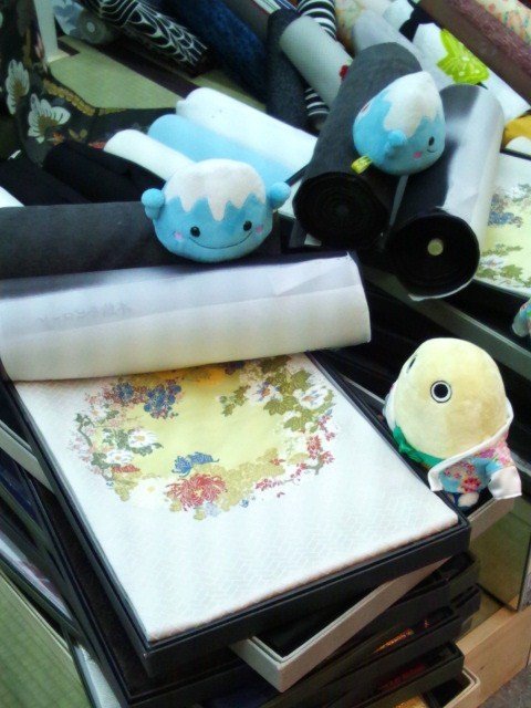 2012.11.18 17:31 白のいろいろ まゆまろ君とふじさん君の大冒険!? オープン前は、急激に登場回数が増えていたまゆまろ君とふじさん君の二人ですが、ちょっとだけご無沙汰しちゃいましたね。そんな二人が店内探検を始めたのでパチリです!! 今日は、この袋帯が気になったみたいですね。このとても細かなお花のリースの柄は織なんです!そして、もちろん手機!!すごい技術ですよね。さすが“きもの白”にいる二人です。お目が高い! by kyoko 白のいろいろ