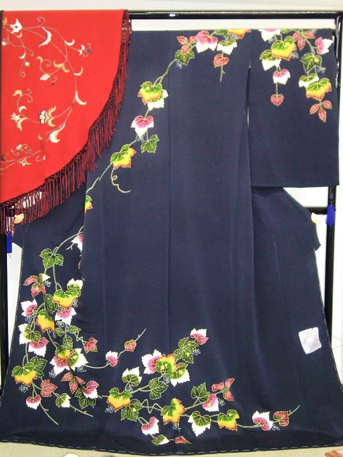 2012.12.14 18:32 白の新作 素敵な訪問着をご紹介します!! 久呂田明功作の素敵な訪問着をご紹介します!! しぼ感をしっかり感じる事の出来る鬼しぼ縮緬に、たっぷりと蔦を描いた訪問着です。地色は濃い目のなす紺で深みがあり、胸から肩、そして上前まで流れるように描かれた蔦が、印象的です。 左肩の辺りに掛けてある半円のショールは、しっとりとした縮緬地に唐花の刺繍がおしゃれです。 どちらもショッピングサイトにはアップしていないので、ぜひお店でご覧くださいね。遠くて行けない!!という方はコチラからお問い合わせくださいね。 by kyoko 白の新作