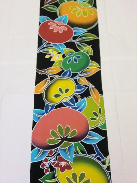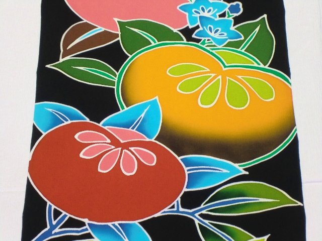 赤、オレンジ、黄色、ピンク、緑と、どの色もしっかりした発色のばかりで黒地に映えます。柄の大きさもインパクト大ですね。ただ、お仕立てをする時には生地を裁つので、ここまで大きなたちばなを感じて頂くのは難しいかもしれませんね。