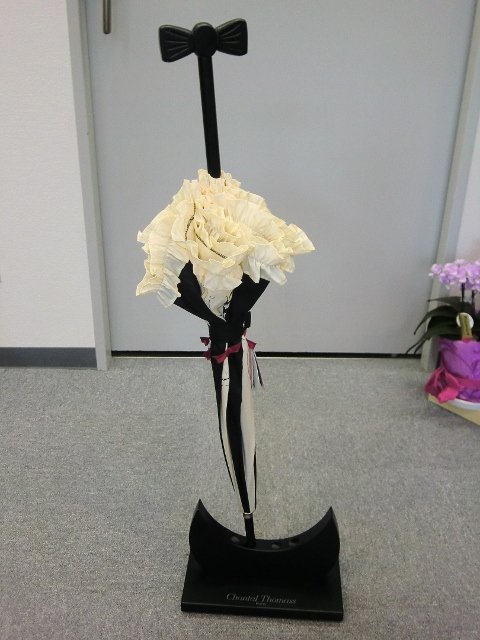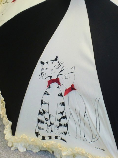 どちらの猫もちっちゃな赤い蝶ネクタイをしています。これは、実際にリボンのようにくっついているんですよ。傘の縁のフリルもポイントです!