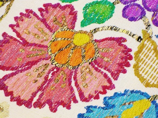 今日ご紹介するのはカラフルな“東欧唐花文”八寸帯です。ざっくりとした風合いで暖かみがあり、秋冬のお着物にピッタリです。