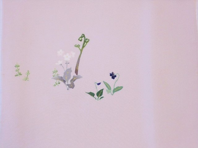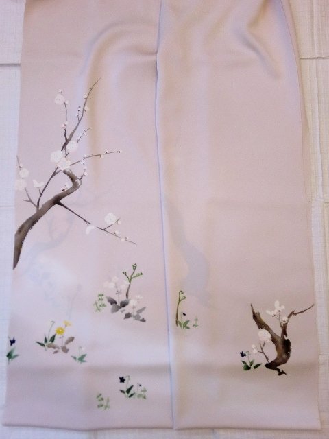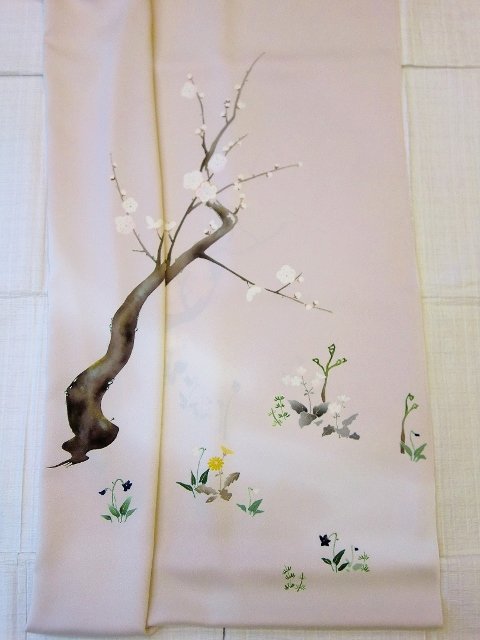 淡くやさしいピンクの地色に梅の木、サクラソウ、スミレなど春を感じられるお花が描かれてます。裾の方には白くかすみのようなぼかしが入っています。川のせせらぎのようにも見え、とても風情があります。