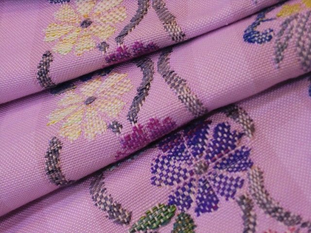 薄いピンク色地の花かづら柄の八寸帯です。優しい色使いでこれからの季節にピッタリです。ざっくり感があるので紬に合わせて頂くのにおすすめです。