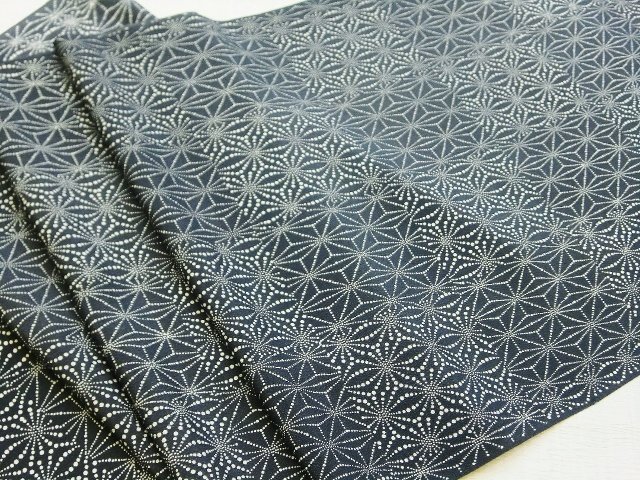 そして、着物は麻の葉柄の古代型小紋です。大きさの違う麻の葉柄を市松になるように染めつけたモダンな小紋です。仕立てあがってお召し頂くと、大き目な市松の着物のようにも見えます。