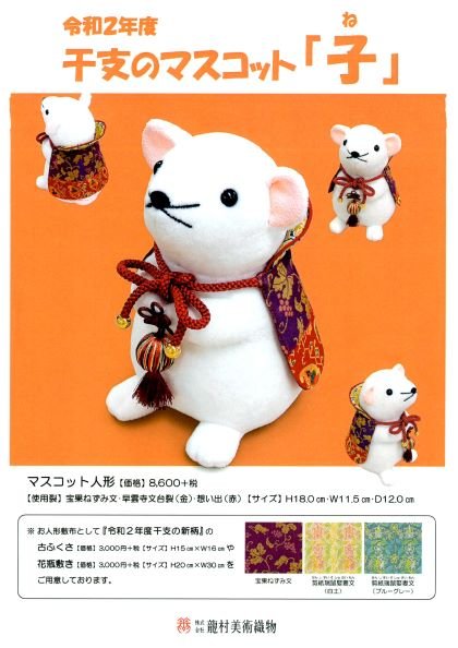 2019.10.04 11:43 白のいろいろ 干支マスコットのご紹介です。 今年も、もうこの時期がやってきました。 龍村美術織物の干支マスコットの登場です!! ふっくらフォルムのねずみちゃんが、かっこいいマントをまとっています。もちろんまとったマントの柄にもねずみさんがいますよ。 金額:8,600(税抜) マントに使われた裂は 宝果ねずみ文・早雲寺文台裂(金)・想い出(赤)です。 ご購入後希望の方は、お問い合わせからご連絡くださいね。 by kyoko 白のいろいろ