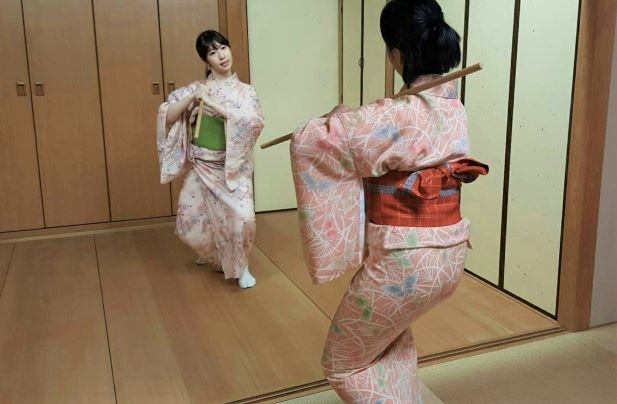 Komaki Fujima who is a member of the Japanese Dance Association Inc., a member of Fujimori-kai, and a member of the Dance league of Suginami ward, gives private lessons of Classical Japanese dance one by one at a training room of her house.