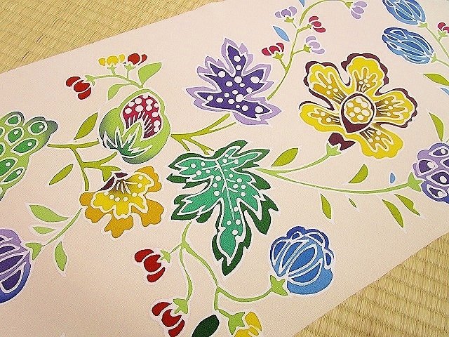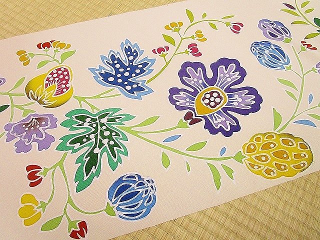 少しクリームがかった白地にカラフルにお花やフルーツ!?が染められた“ろうけつ小紋”です。模様は繰り返しで現れますが、模様のさし色は変えられていて、1反広げてみると、とても楽しくハッピーいっぱいになれること間違いなしです。