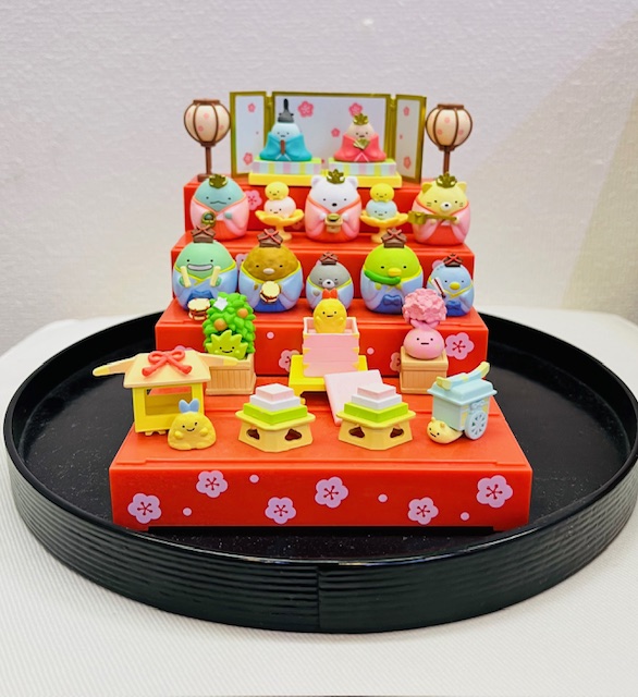 お客様に頂いたすみっコぐらし雛飾りをルンルンしながら飾っちゃいました♪ちょっと不安定で、屏風やぼんぼりがころりんとすることもありますが、かわいいおひな様に会いにいらしてくださいね。