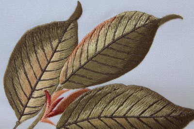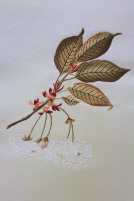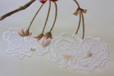桜の刺繍は、どこをとっても細やかな色の配色と技術で、陰影や柔らかな表情は桜の香りが伝わってくるかのようです。