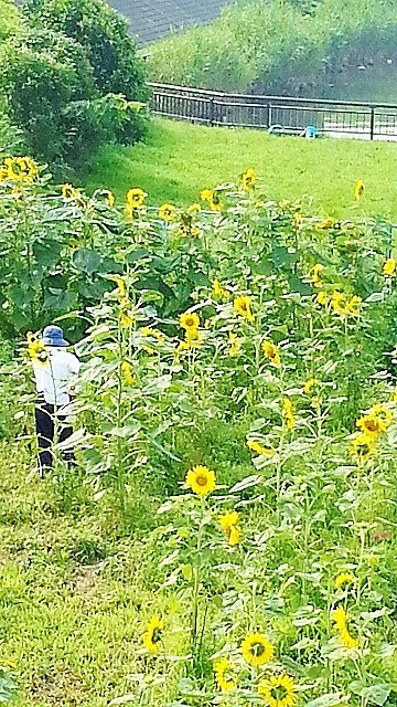 かなりの数のヒマワリが、すっくと伸びてきれいなお花を咲かせています。一緒に写っている人の大きさと比べると、かなりの高さなのが分かりますね。これだけのヒマワリ畑だと、かくれんぼが出来そうな気が・・・。