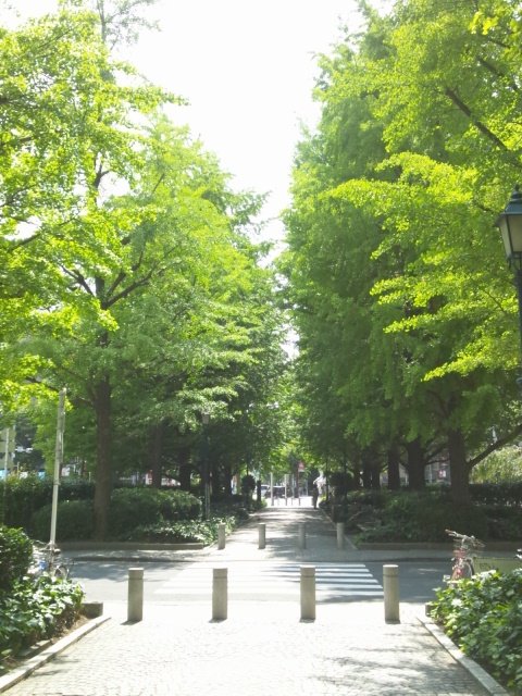 ここは、秋になるときれいな黄色一色の道になるイチョウ並木で、どうしても、紅葉の時にばかり写真を撮ってしまうのですが、今回はきれいな緑の葉が太陽の日差しでキラキラと輝いているところをパチリです。