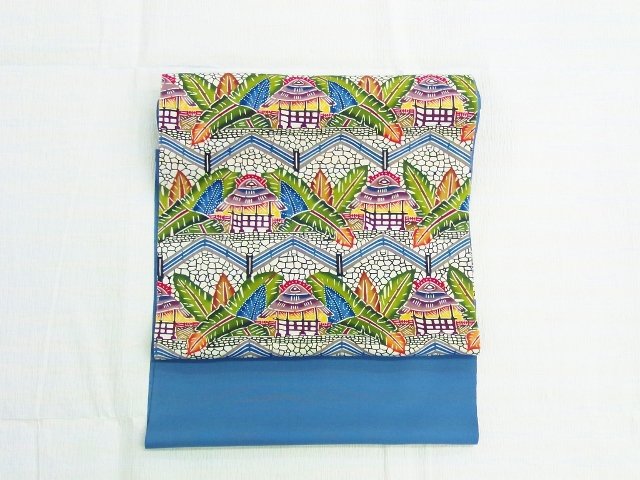この帯は城間栄順さんの染められたもので石垣と家、そして芭蕉が勢いよく描かれている沖縄の原風景の塩瀬の紅型名古屋帯です。地色は水色ですが、たれ先部分以外は、地色が分からないぐらいたっぷりの柄で埋め尽くされている豪華な一本です。お家や芭蕉の色も、とても生き生きとした、綺麗な色合いで、色々なお着物に合わせてお使い頂けますよ。