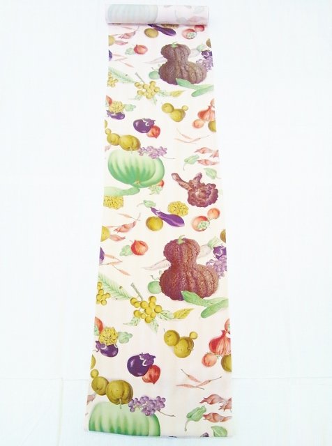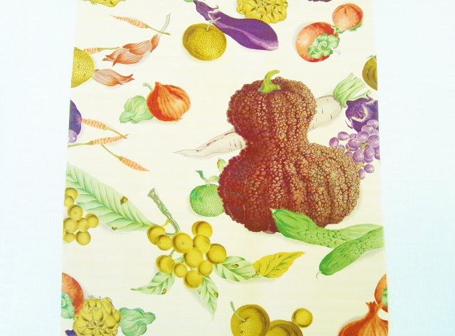 昨日ご紹介した襦袢の柄違いで、今日はお野菜、果物てんこ盛りの襦袢をご紹介します!!個性的なフォルムの西洋野菜に風情のある!?京野菜、果物も色々な物が描かれています。何種類描かれているか、数えたくなっちゃいますね。昨日の襦袢と同じくアンティークな絵画のようで、とってもお洒落ですよ。あっ、地色は一枚目の写真に近い薄いピンク色系です。