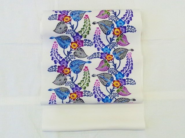 塩瀬地に葵柄をカラフルに染めた紅型の名古屋帯をご紹介します。