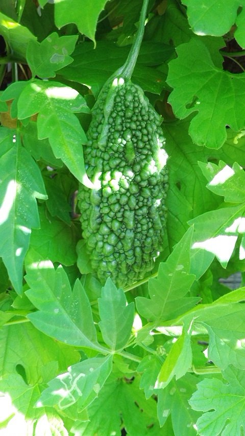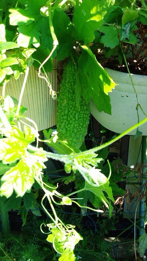 通りがかりにゴーヤ君を発見。まだ小さいから今度撮ろうかなぁ・・・っと、その日はスルー。そして数日後にそろそろ大きくなったかな?と思ってみてみると!!そこにはゴーヤ君の姿はなし。栽培しているお家の方に収穫されちゃったんですね。そんな事が、何度かあってようやくパチリに成功したそうですよ。