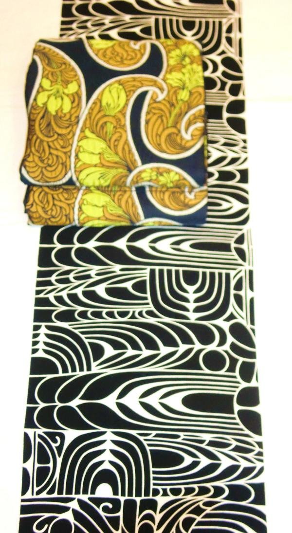 帯は、紺地に大きな勾玉のような模様の中にペーズリー柄を織り出した、こちらもモダンな袋帯です。