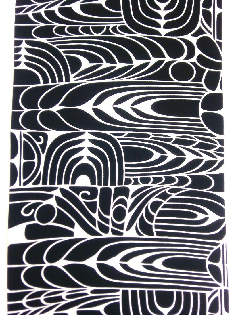 お着物は、黒地にアールデコ調のイメージでつくられています。雰囲気のあるラインが特徴的で、思わず吸い込まれてしまいそうな小紋です。