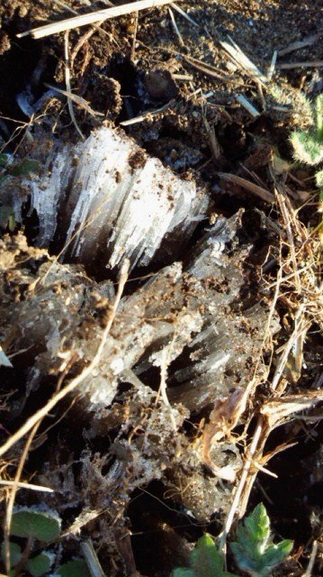 霜柱がキラキラ光ってたそうです。かなりいっぱいで思わずザクザク踏みしめてみたくなるぐらいですね。そして、アップの写真も届いたので、もう一枚!!