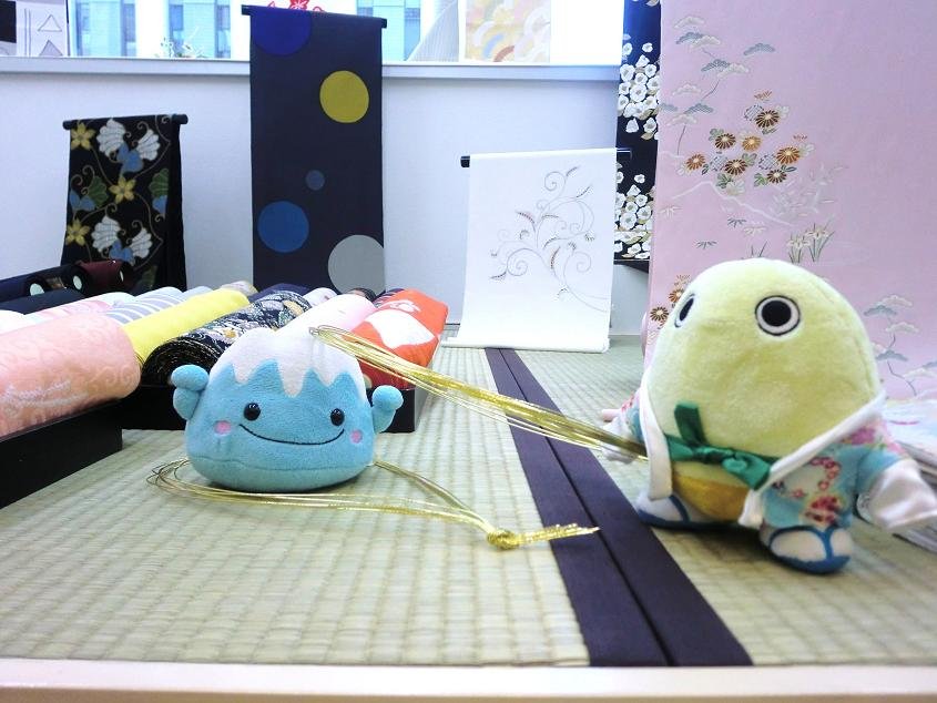 初絹用のお正月飾りに使っている水引で、輪投げ大会です。ふじさん君に向かってまゆまろ君が水引の輪を投げていますよ。