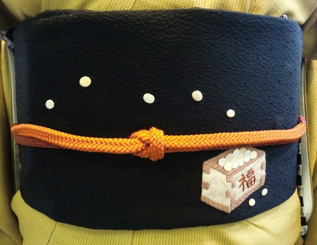こんな節分の帯もあるんですよ!ぷっくりアップリケの鬼さんがかわいい名古屋帯です。前柄には福豆が!!年齢の数だけ食べて、しっかり厄払いをしなくちゃですね。