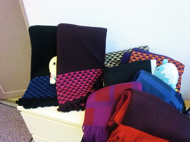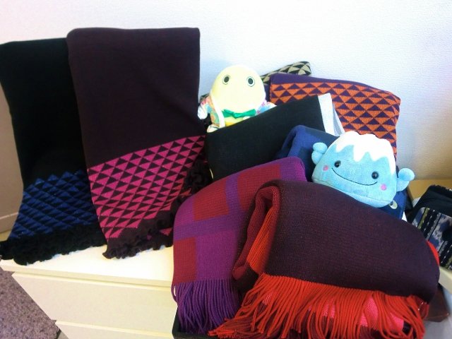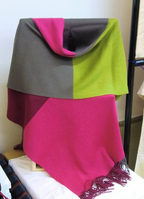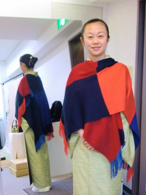 大判のショールの真ん中に切れ目が入っているので後ろは長く腰まであったかで、前は衿元にくるっと巻きつけてお使いいただけます。もちろんお洋服用に作られたものですが、お着物でもとってもおしゃれですよ。