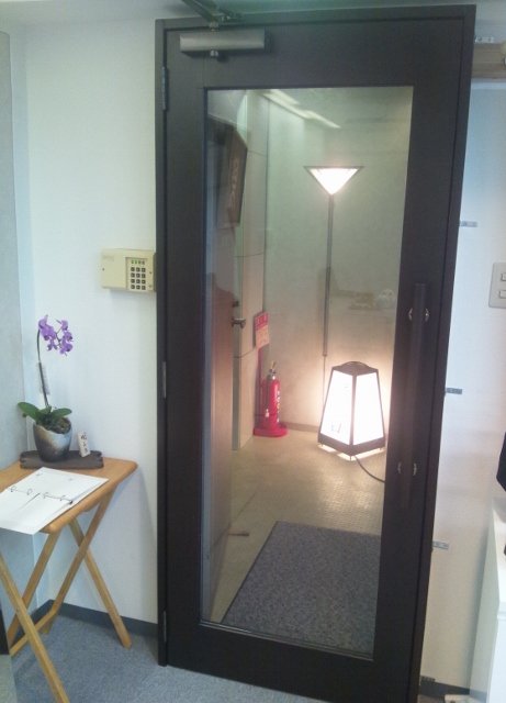 もともとの扉は、重たくて中も見えないタイプの普通の扉だったので、扉を開けるのに少し勇気がいる!?という事で、エレベーターを降りたらすぐに明るい店内を感じて頂ける扉を設置しました。